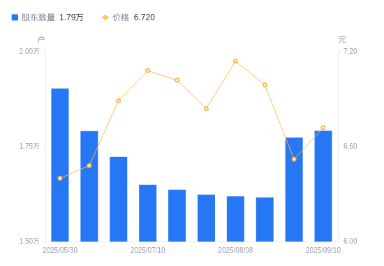 日期A股户数(户)流通A股户均持股数(股)户均持股市值(万元)2025-09-101792017092.7011.492025-08-291773817268.0811.262025-08-201616418949.5913.252025-08-081619118917.9913.512025-07-311623818863.2312.902025-07-181636718714.5613.142025-07-101649418570.4613.152025-06-301723117776.1712.252025-06-201791017102.2411.082025-05-301902916096.5510.30